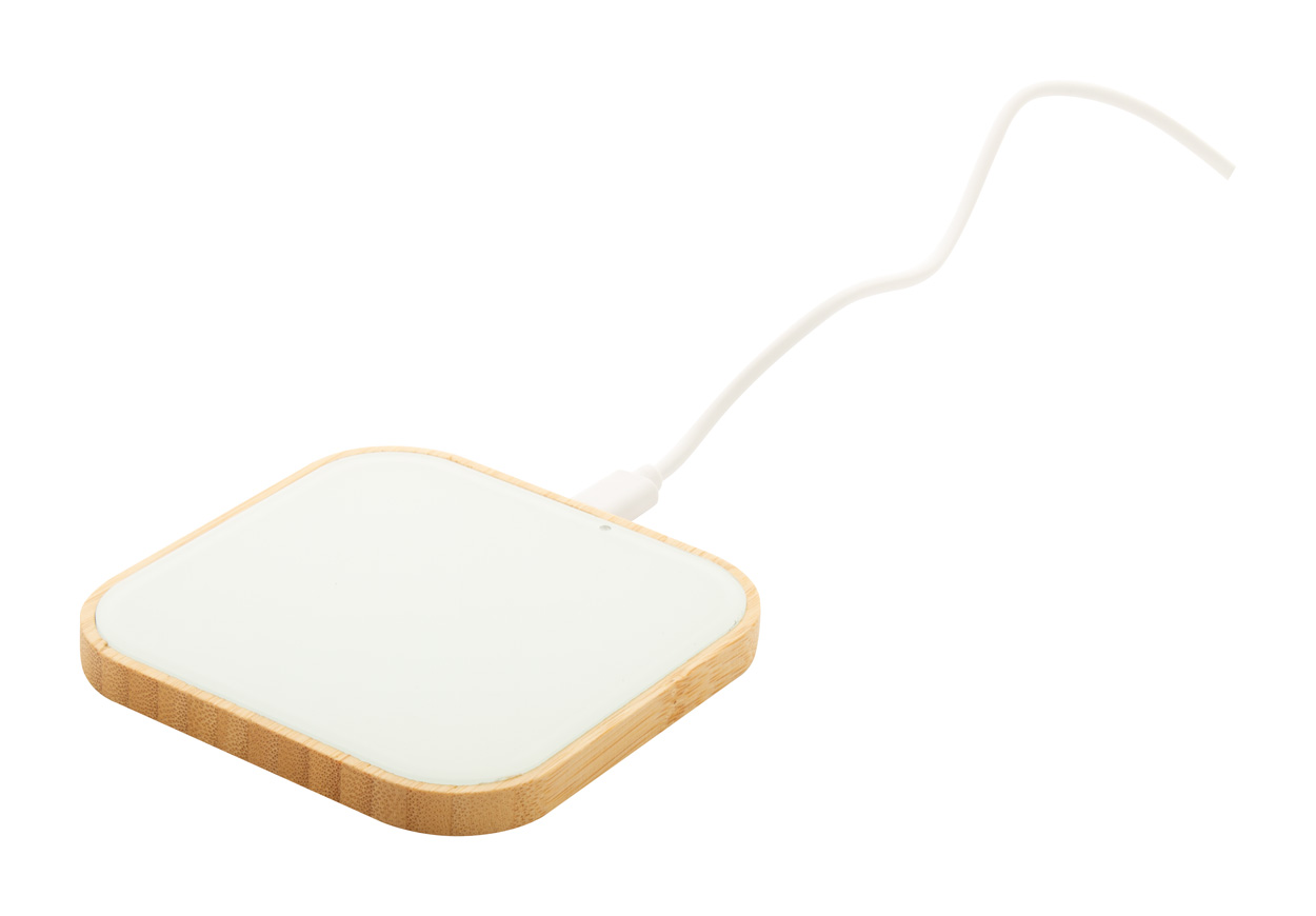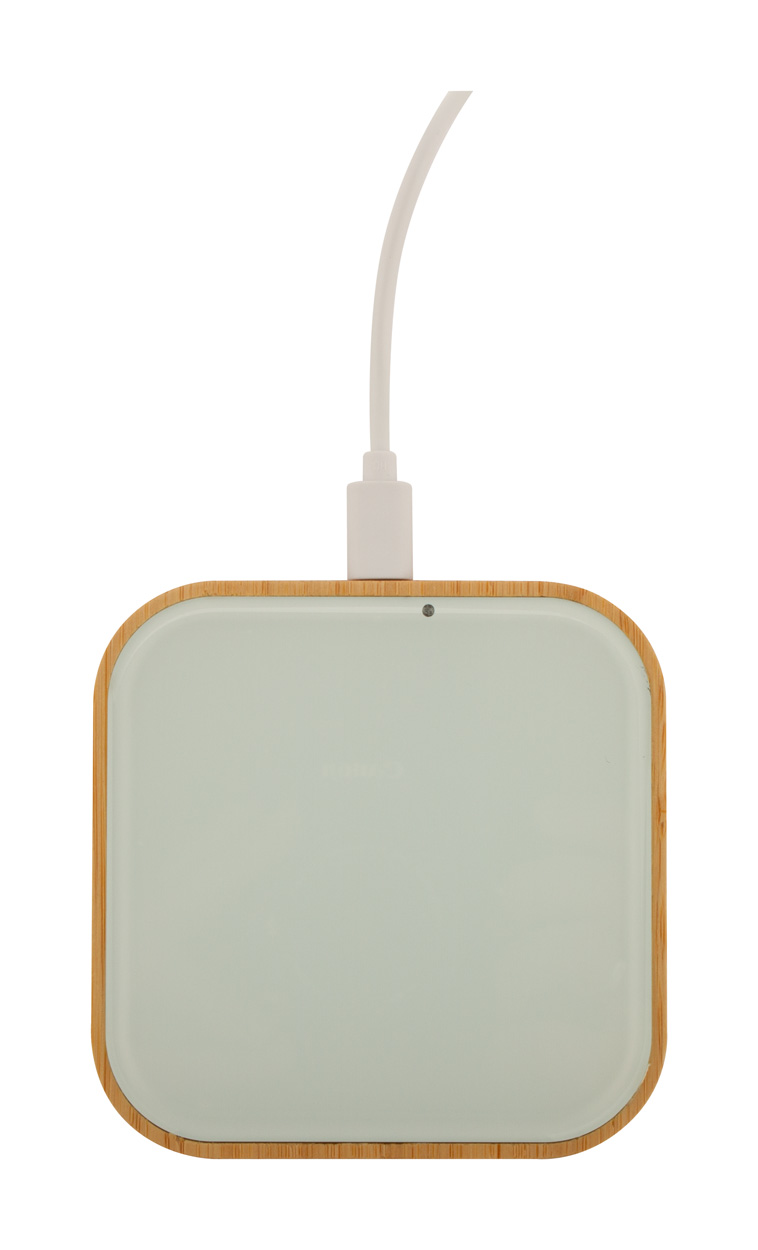 Bezdrátová rychlonabíječka (10W) v bambusovém pouzdře s povrchem z tvrzeného skla. Včetně USB nabíjecího kabelu. Rozměr: 93×93×9 mm
