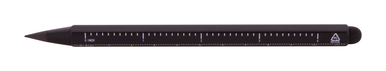 Bez inkoustové pero s dlouhou životností z recyklovaného hliníku s dotykovým stylusem a hrotem z kovové slitiny, který oxiduje papír. S šestihrannou hlavní včetně pravítek 11 cm a 4 palce. Toto pero píše podobně jako tužka a navíc je stíratelné. Rozměr: o9×150 mm