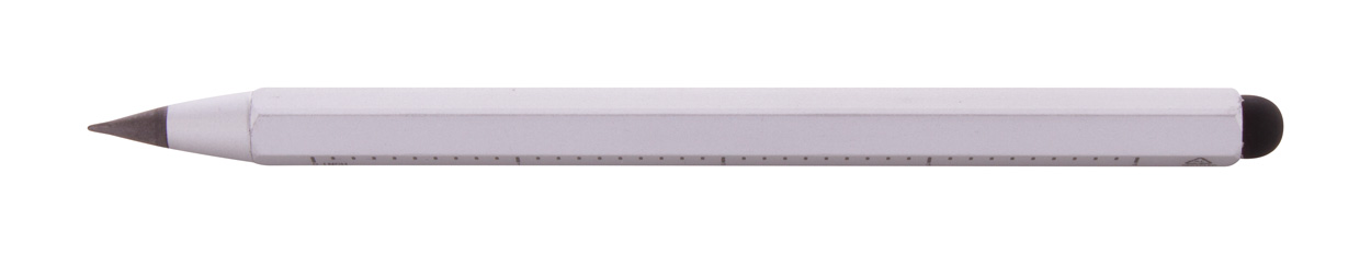Bez inkoustové pero s dlouhou životností z recyklovaného hliníku s dotykovým stylusem a hrotem z kovové slitiny, který oxiduje papír. S šestihrannou hlavní včetně pravítek 11 cm a 4 palce. Toto pero píše podobně jako tužka a navíc je stíratelné. Rozměr: o9×150 mm