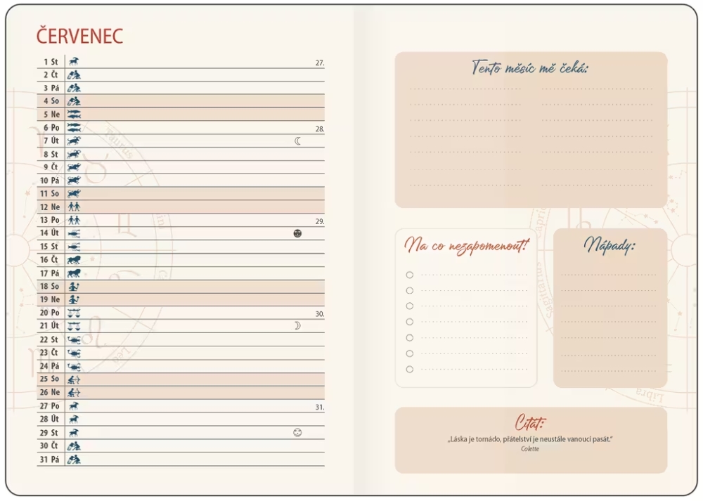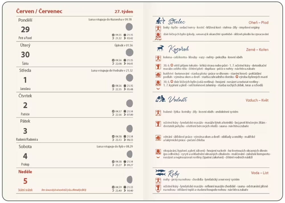 Diář orientovaný na praktické rady, podle kterých se můžete řídit během lunárního cyklu a s informacemi týkajícími se péče o tělo, domácnost, kutilství a zahradu. Desky jsou vyrobeny z matného lamina s oblíbeným hedvábným povrchem soft touch. Diáře jsou doplněny gumičkou přes hřbet, záložkou a třemi aršíky kreativních samolepek. Rozměry: 12,5 x 17,6 cm
