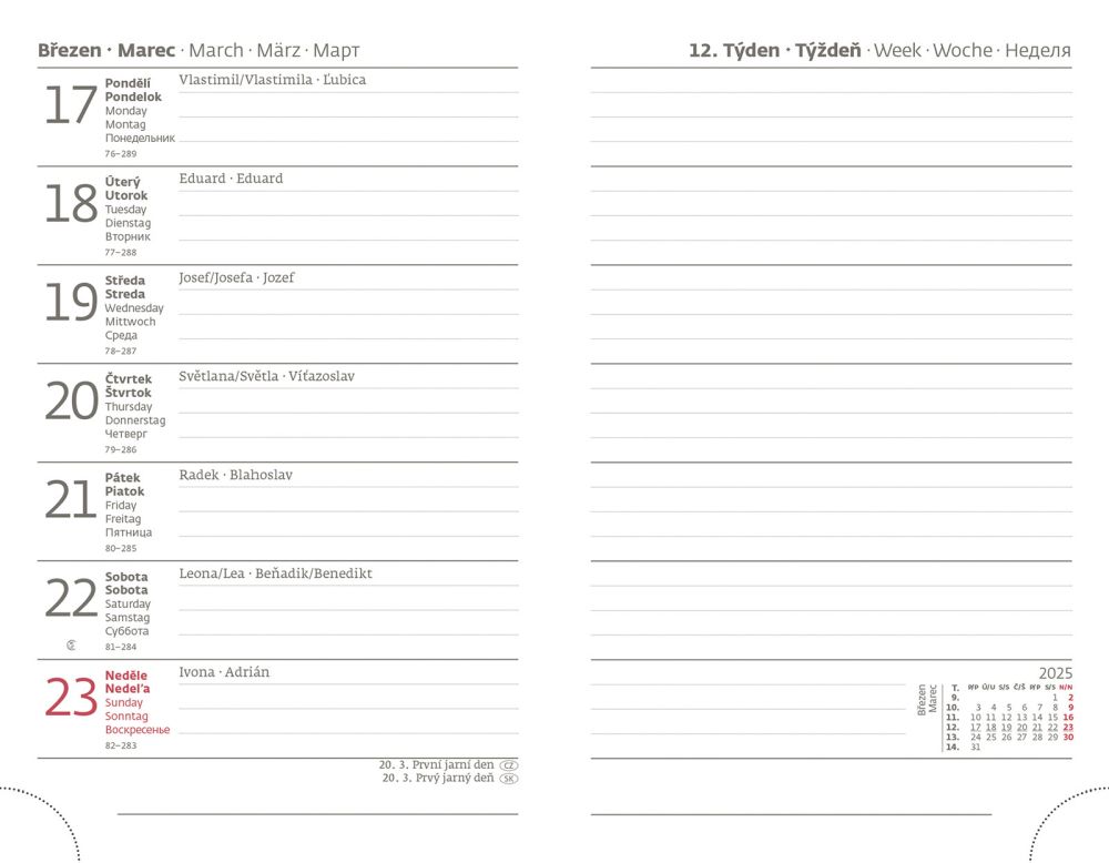 Oblíbené originální designové diáře vynikají deskami, které jsou upraveny speciální laminací s hedvábným efektem, díky které jsou velmi příjemné na dotek. Doporučujeme tamponový tisk. Diář obsahuje: osobní údaje, plánovač dovolené (měsíční přehled), plánovací kalendář, mezinárodní svátky, roční výhled, týdenní layout, adresář. Rozsah diáře: 128 stran. Rozměry: 9 x 14 cm.