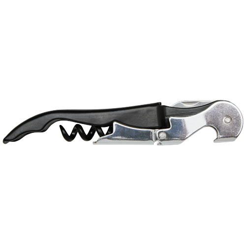 Nerezový číšnický nůž s barevným tělem s vývrtkou, řezačkou fólie a otvírákem na lahve. Díky dvoustupňové konstrukci lze snadno vytáhnout zátku z lahve. Rozměry: 12 x 1,1 x 2,2 cm