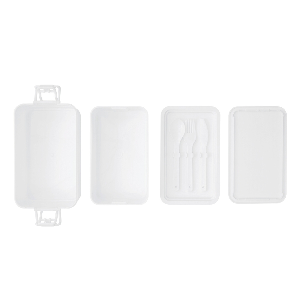 Obědový box, zamykací klipy, 2 stohovatelné přihrádky (objem cca 1 000 ml + 1 300 ml), prostřední víko s příbory (nůž, vidlička, lžíce), prostorově úsporné stohovatelné provedení, v krabičce. Rozměry: 20,4 x 12,4 x 8 cm