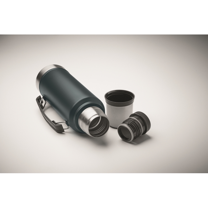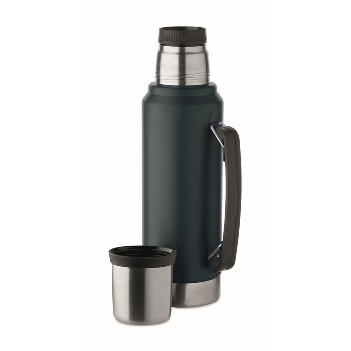 Dvoustěnná vakuová izolační láhev z recyklované nerezové oceli (90 % recyklované nerezové oceli a 10 % nerezové oceli) s boční rukojetí. Víčko z PP a kelímkem z recyklované nerezové oceli. Objem: 1 l.Rozměry: 13 x 9 x 33cm