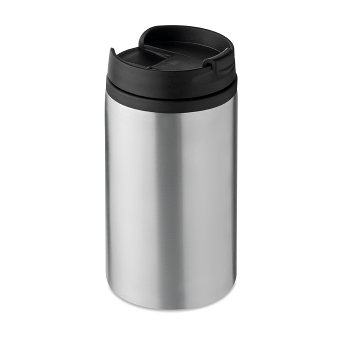 Dvoustěnný nerezový hrnek s těsnícím uzávěrem. Vnitřní vložka z PP. Objem 250 ml. Matný stříbrný. Rozměr: O7X14.5cm.