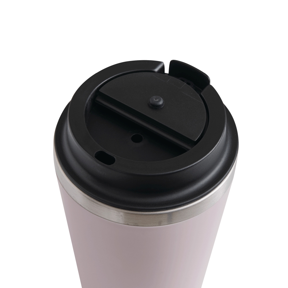 Dvoustěnný cestovní hrnek, uvnitř z nerezové oceli a zvenku z plastu, bezpečné šroubovací plastové víčko s integrovaným otvorem na pití a silikonovým těsněním, kapacita cca. 350 ml, udrží teplo cca. 2 hodiny a za studena až 4 hodiny. Rozměry: O9 x 15 cm