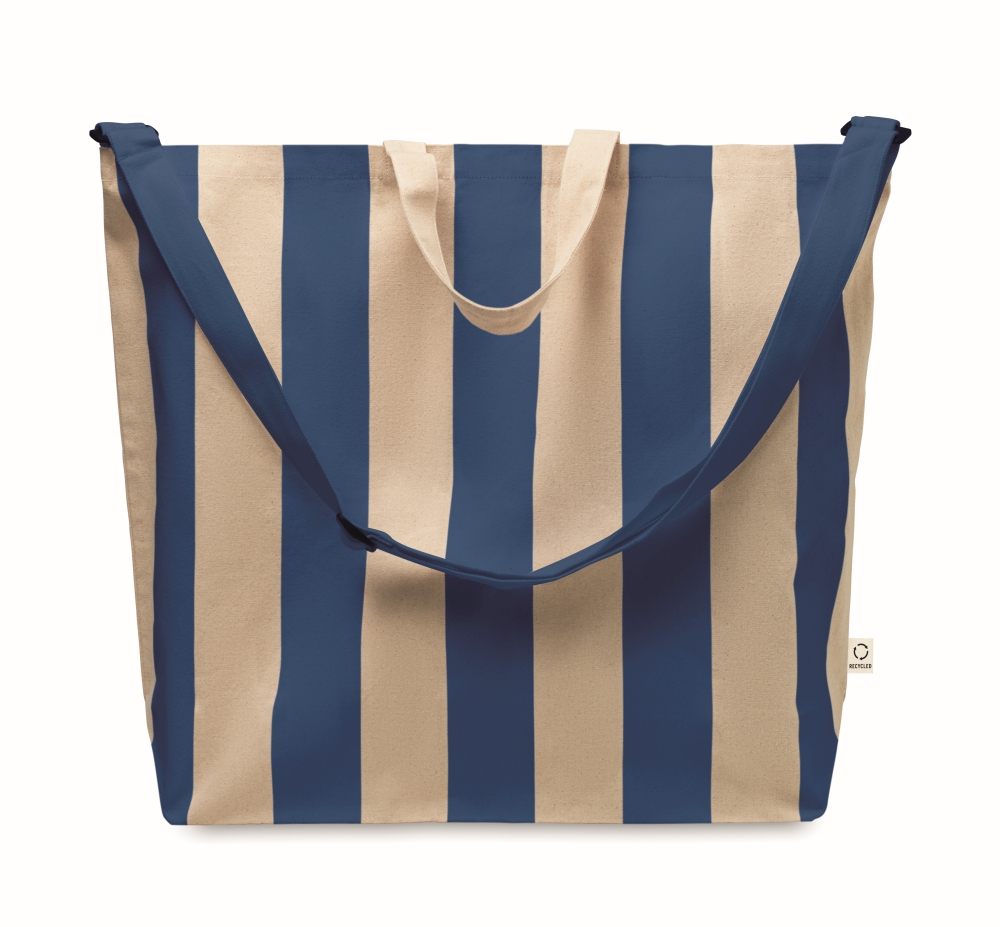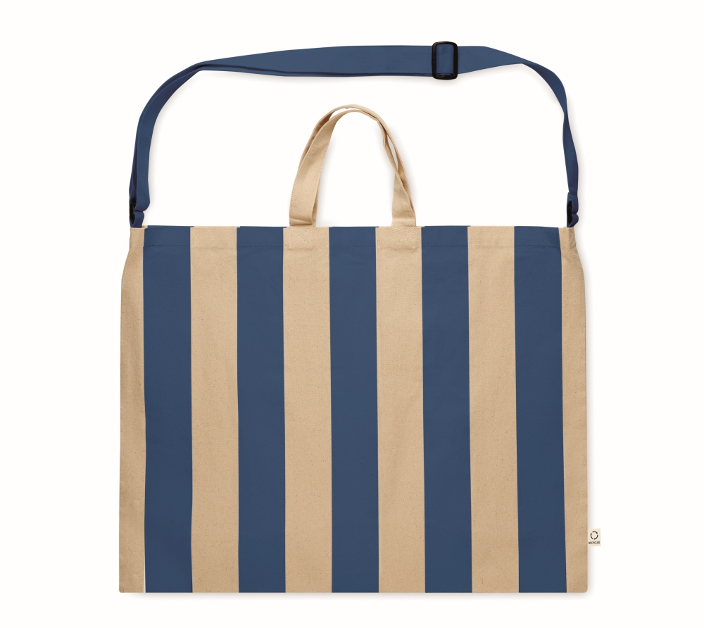 Extra velká pruhovaná plážová taška z recyklované 280g bavlny (80 %) a recyklovaného polyesteru (20 %) s vnitřní kapsou. Krátká ucha a jeden velký nastavitelný ramenní popruh. Rozměry: 46 x 16 x 60 cm