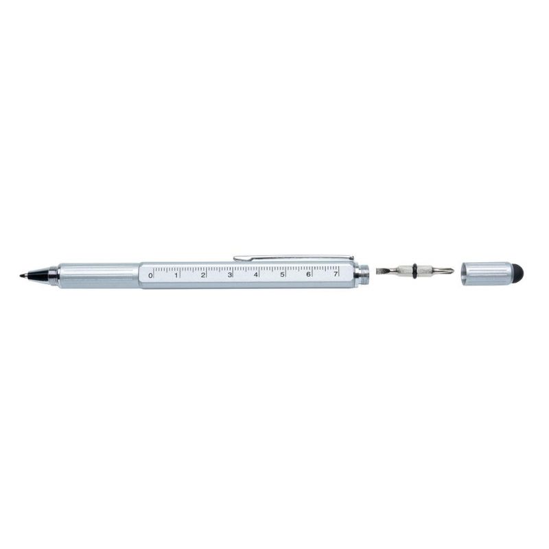 FRODO Multifunkční kuličkové pero s pravítkem (7 cm), vodováhou, šroubovákem a kuličkovým perem, stříbrná