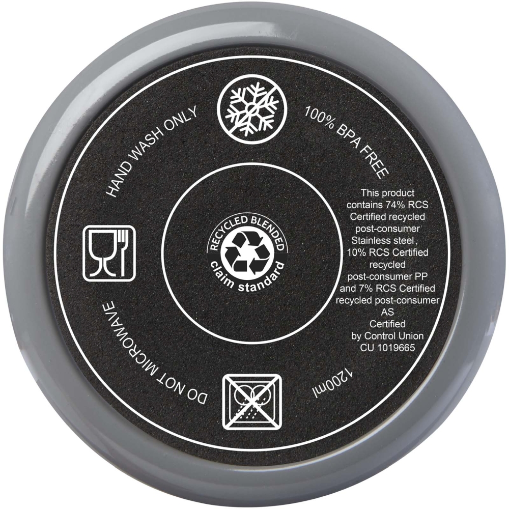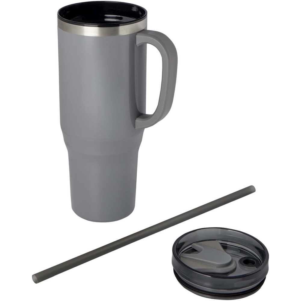 Hrnek se vyznačuje odolnou konstrukcí s dvojitou stěnou, která udržuje nápoje horké nebo studené v jakémkoli prostředí. Vnitřní stěna hrnku je vyrobena z recyklovaného plastu, vnější stěna z recyklované nerezové oceli. Hrnek o objemu 1200 ml nabízí stylový způsob, jak zůstat hydratovaný po celý den. Má přítlačné víčko odolné proti vyšplíchnutí se dvěma otvory a otočným uzávěrem. Dodává se s recyklovaným brčkem potravinářské kvality. Nedoporučujeme mýt v myčce. Rozměry: 13,8 x 26,1 x 10 x O 10 cm