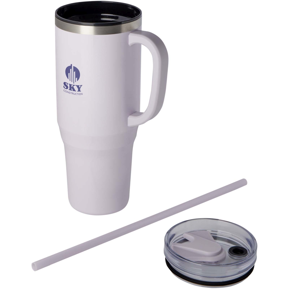 Hrnek se vyznačuje odolnou konstrukcí s dvojitou stěnou, která udržuje nápoje horké nebo studené v jakémkoli prostředí. Vnitřní stěna hrnku je vyrobena z recyklovaného plastu, vnější stěna z recyklované nerezové oceli. Hrnek o objemu 1200 ml nabízí stylový způsob, jak zůstat hydratovaný po celý den. Má přítlačné víčko odolné proti vyšplíchnutí se dvěma otvory a otočným uzávěrem. Dodává se s recyklovaným brčkem potravinářské kvality. Nedoporučujeme mýt v myčce. Rozměry: 13,8 x 26,1 x 10 x O 10 cm