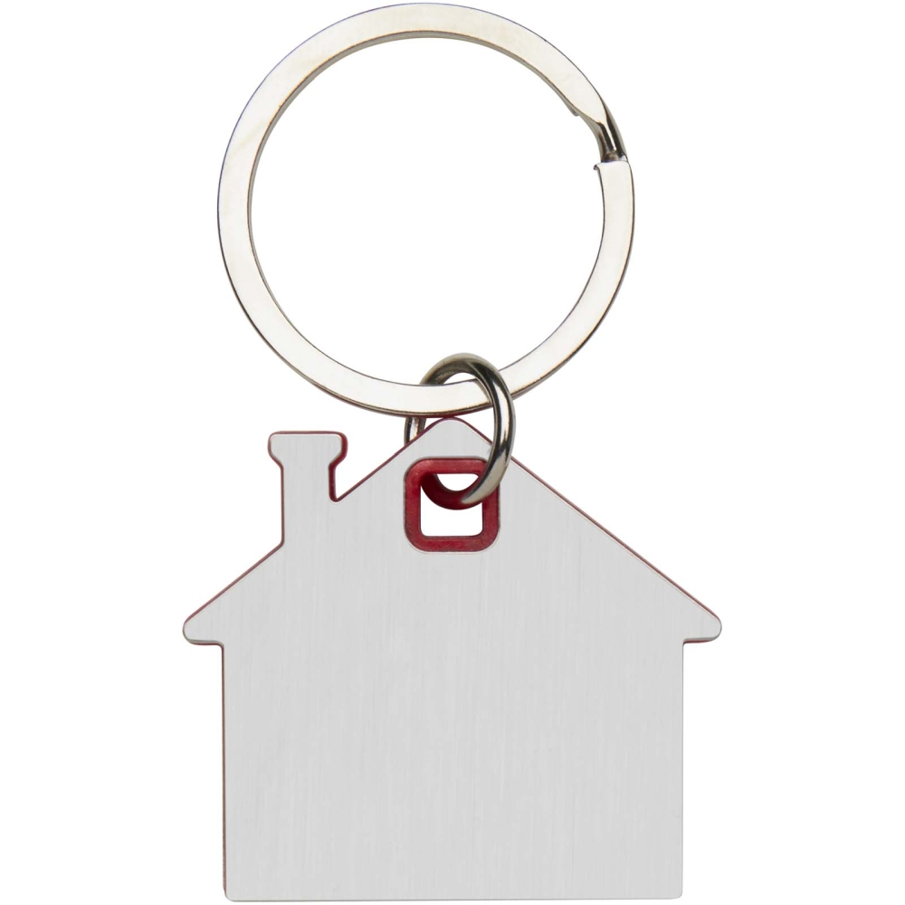 Klíčenka ve tvaru domu s nerezovou destičkou s matným efektem vpředu i vzadu a barevným plastovým čipem uprostřed. Rozměry: 4 x 0,3 x 6 cm