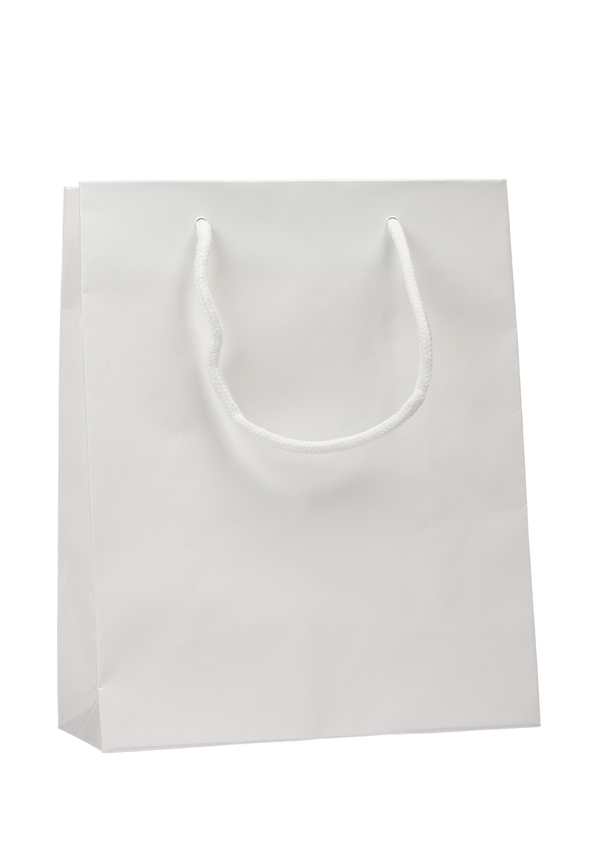 Bílá papírová taška vyrobená z křídového papíru s textilními držadly a lesklým povrchem. Rozměry: 25 × 11 × 31 cm.