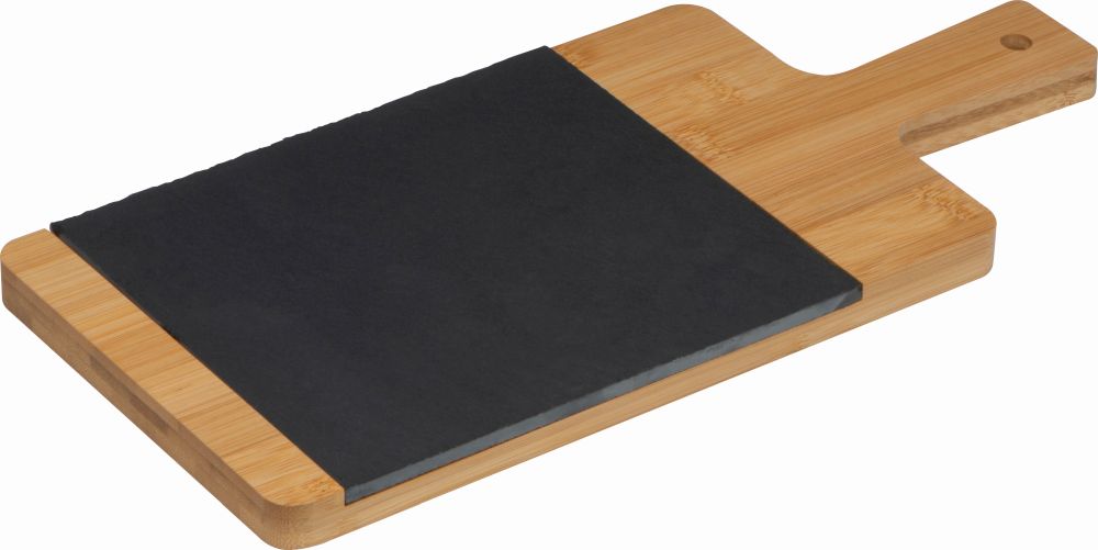 Bambusové prkénko se servírovací břidlicovou deskou. Prkénko má rukojeť i očko na zavěšení. Rozměry: 33 x 15,2 x 1,7 cm