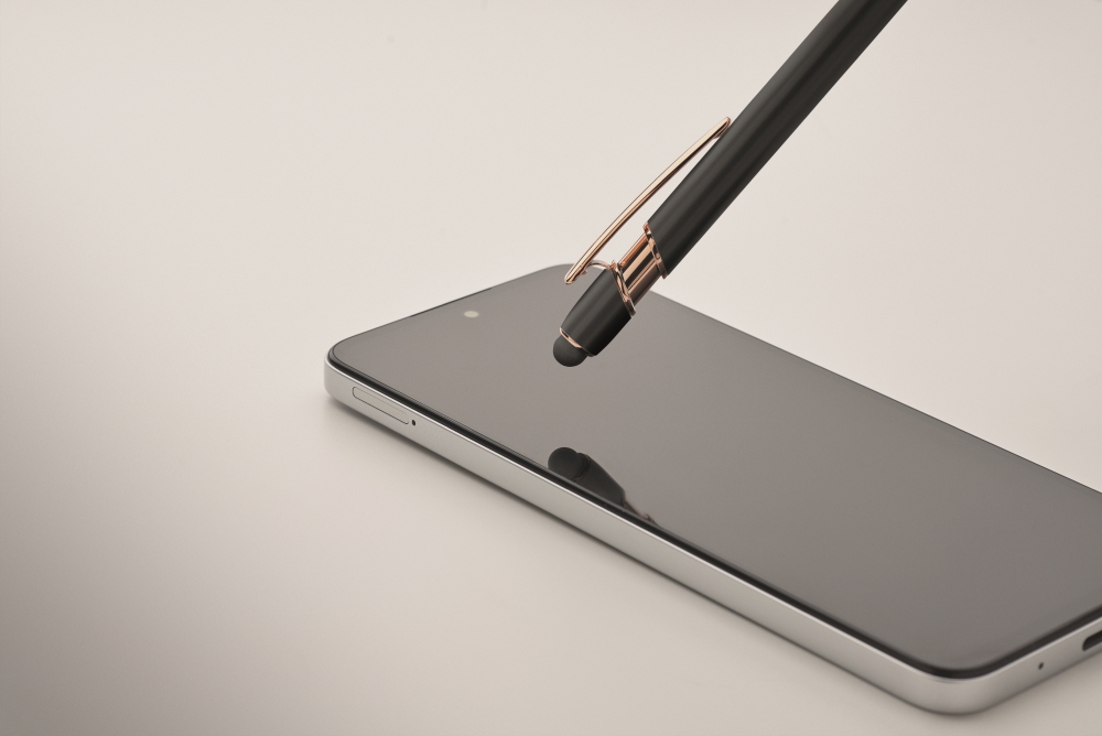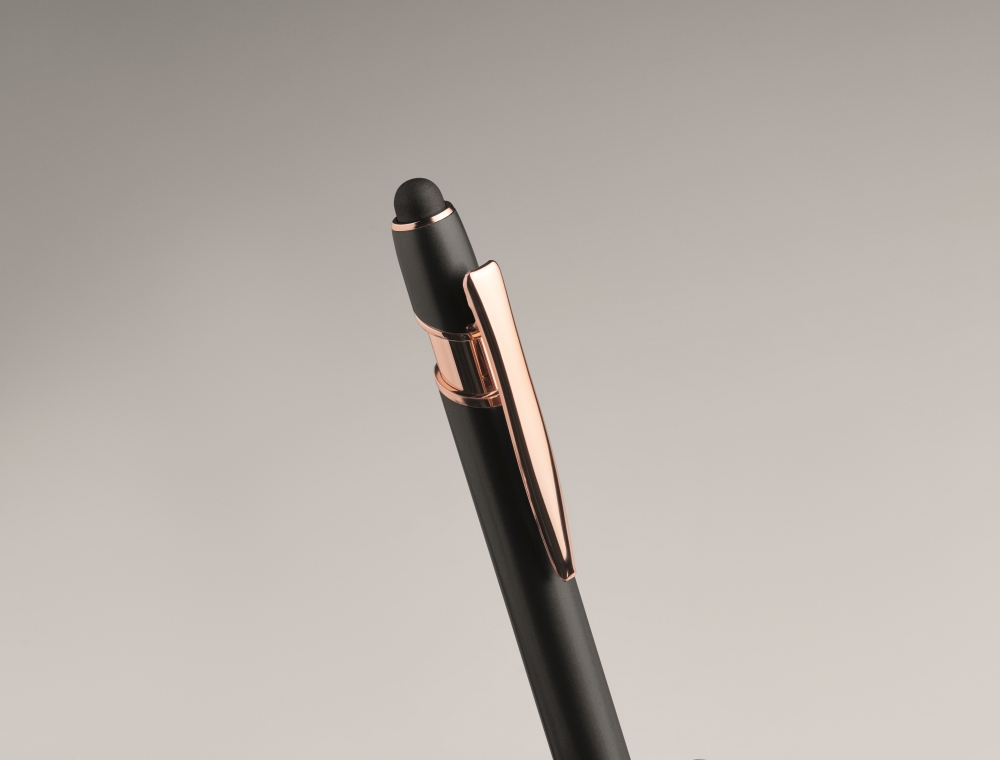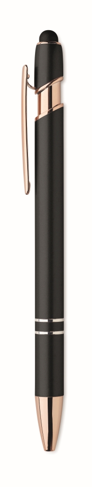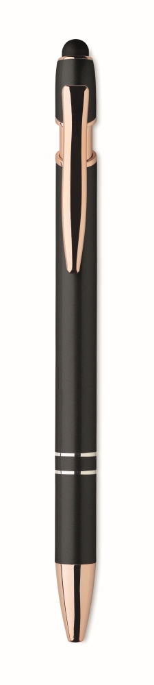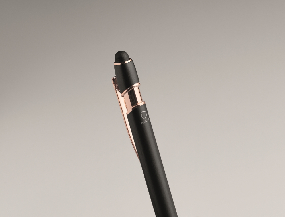 Recyklované hliníkové stylusové kuličkové pero s růžově zlatými detaily. Modrý inkoust. Rozměry: O 1 x 14,3 cm. Materiál: recyklovaný hliník
