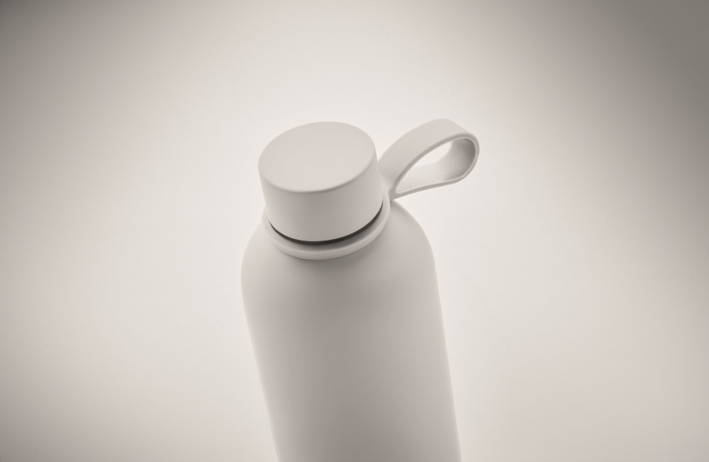 Dvoustěnná izolační láhev z recyklované nerezové oceli (90 % recyklované nerezové oceli a 10 % nerezové oceli) s gumovou povrchovou úpravou a silikonovým poutkem. Objem: 500 ml. Rozměry: O 7 x 22,5 cm. Materiál: nerezová ocel