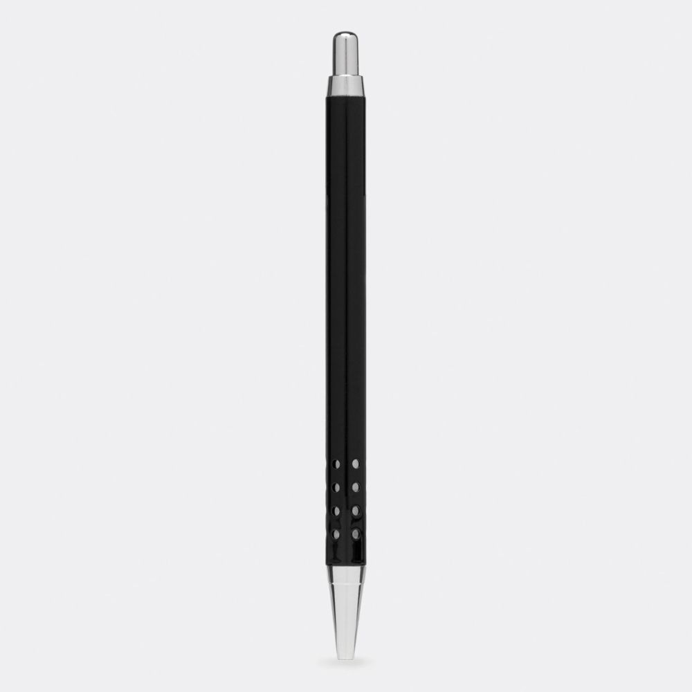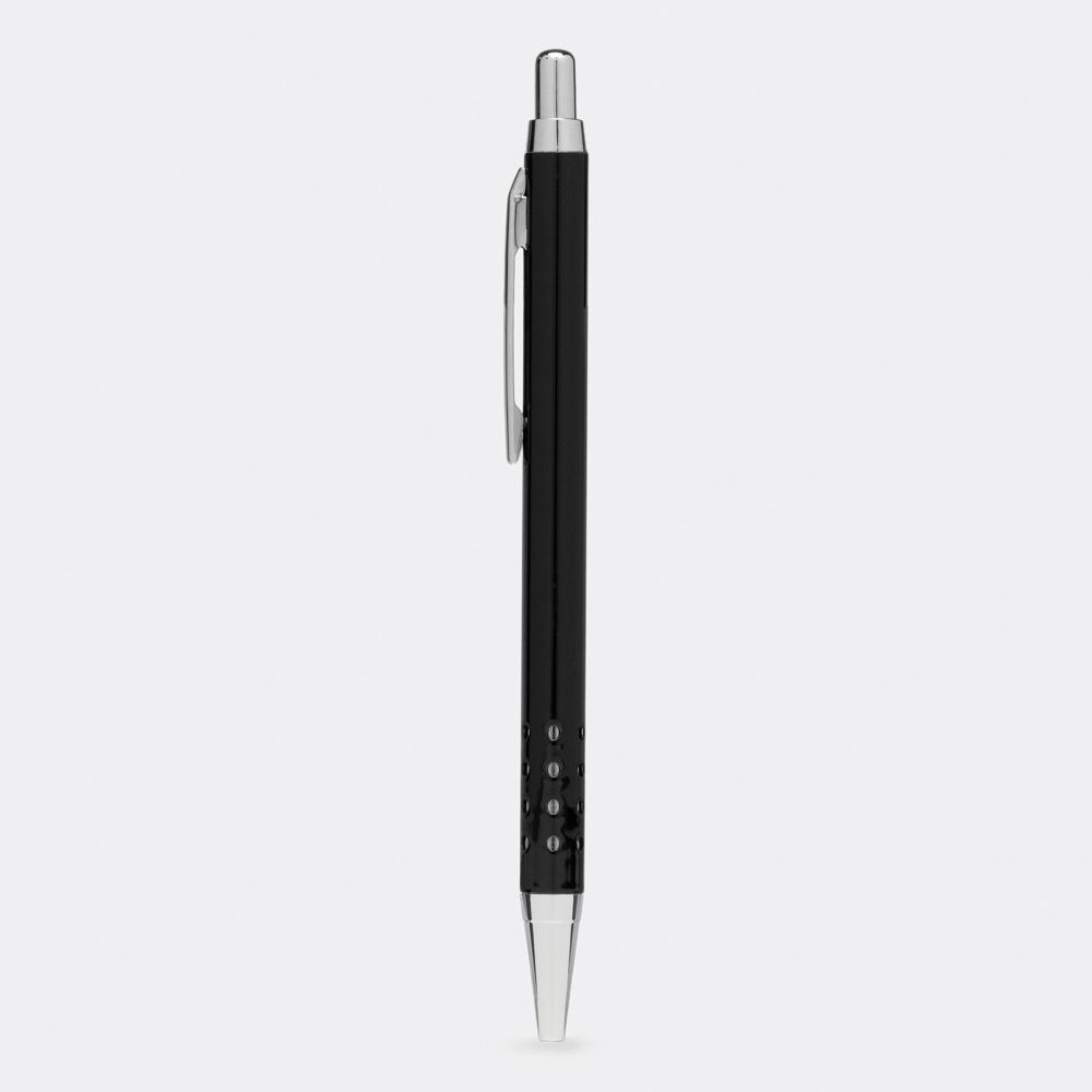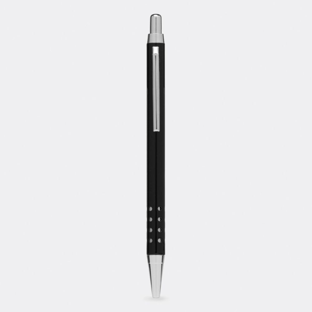 Mosazné pero s modrou náplní a tlačítkovým mechanismem. V úchopové části jsou dekorativní dírky. Rozměry: 13,5 cm