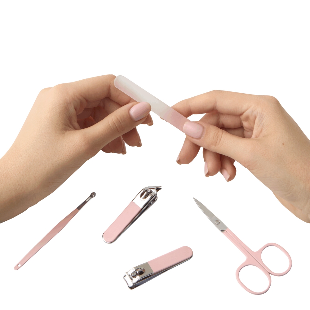 Manikúrní sada, 5 kusů. Obsahuje skleněný pilník na nehty, 2 ocelové kleštičky na nehty (jedny se zkosenou špičkou), nůžky na nehty z nerezové oceli a manikurní tyčinku, v obdélníkovém plastovém pouzdře, baleno v krabičce. Rozměry: 11,8 x 6,7 x 2,1 cm