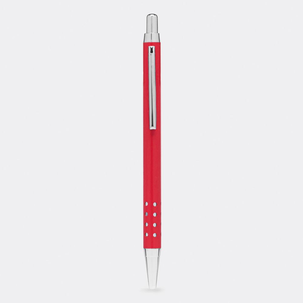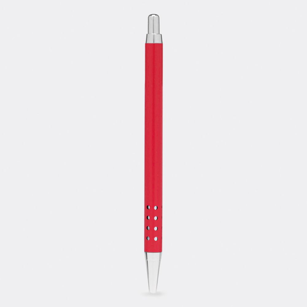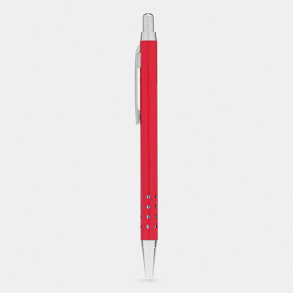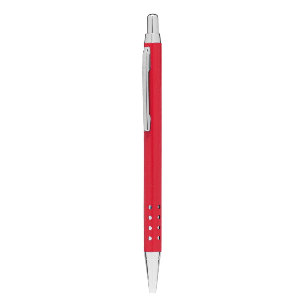 Mosazné pero s modrou náplní a tlačítkovým mechanismem. V úchopové části jsou dekorativní dírky. Rozměry: 13,5 cm