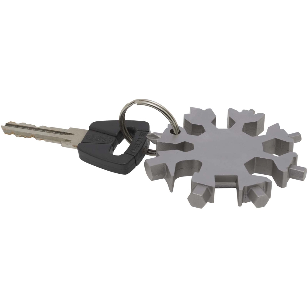 Odolný a kompaktní multifunkční nástroj z nerezové oceli s 8 funkcemi, který můžete nosit na klíčích. Rozměry: 6,3 x 6,3 cm