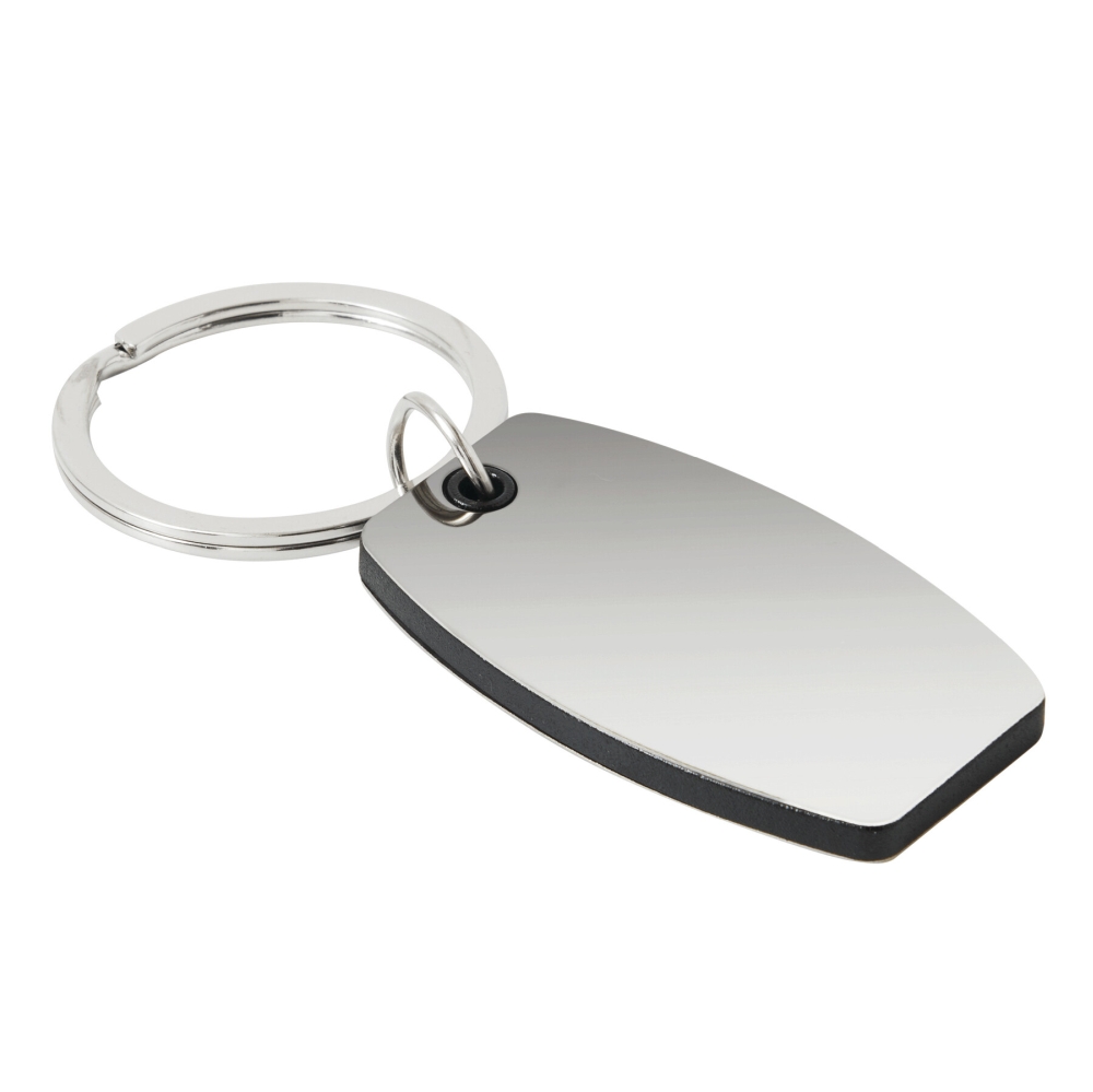 Klíčenka, barevný plast mezi vysoce leštěnou ocelí. Rozměry: 5 x 3 x 0,4 cm