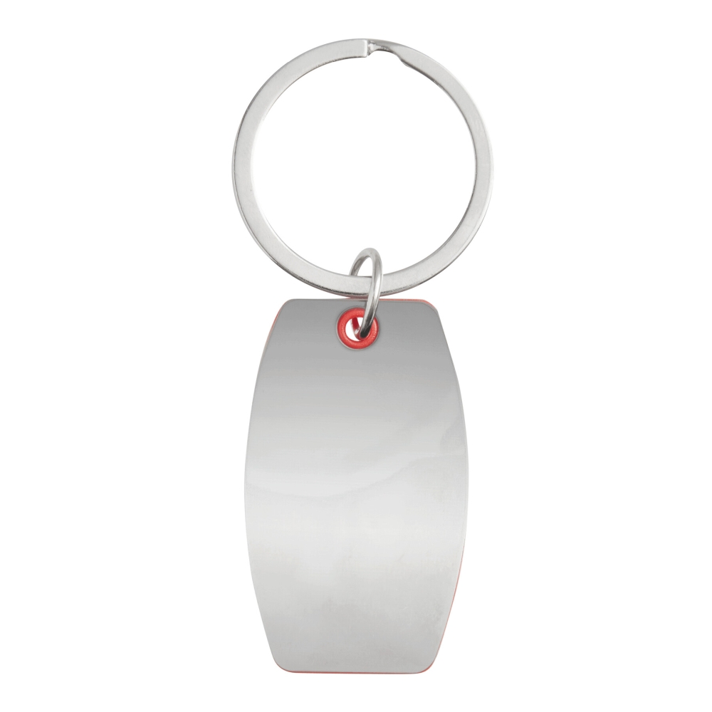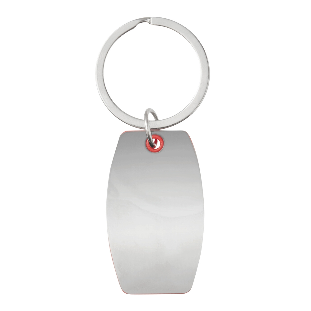 Klíčenka, barevný plast mezi vysoce leštěnou ocelí. Rozměry: 7 x 3 x 0,4 cm