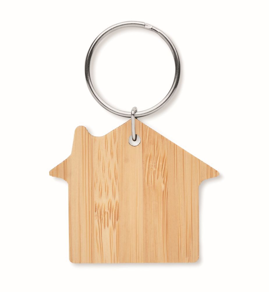 Bambusová klíčenka ve tvaru domečku. Bambus je přírodní materiál, může dojít k mírným změnám barvy, dekorace a velikosti. Neteče. Rozměry: 4,5 x 3,8 x 0,2cm