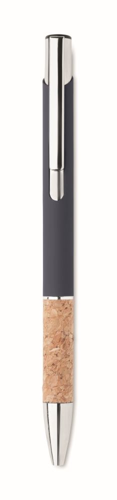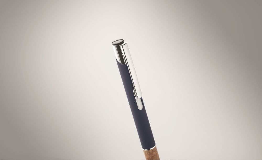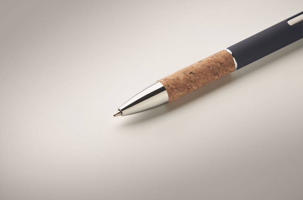 Propiska z hliníku s korkovým úchopem. Modrý inkoust. Rozměry: O1x13,7 cm