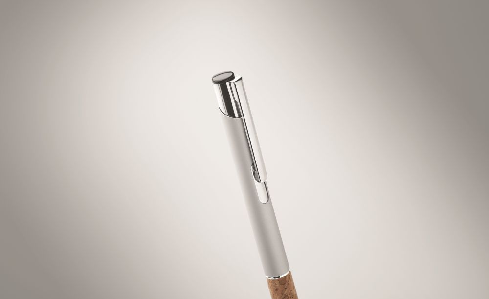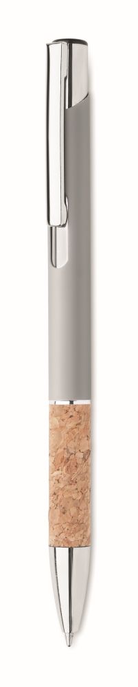 Propiska z hliníku s korkovým úchopem. Modrý inkoust. Rozměry: O1x13,7 cm