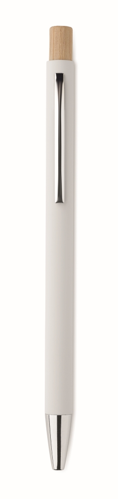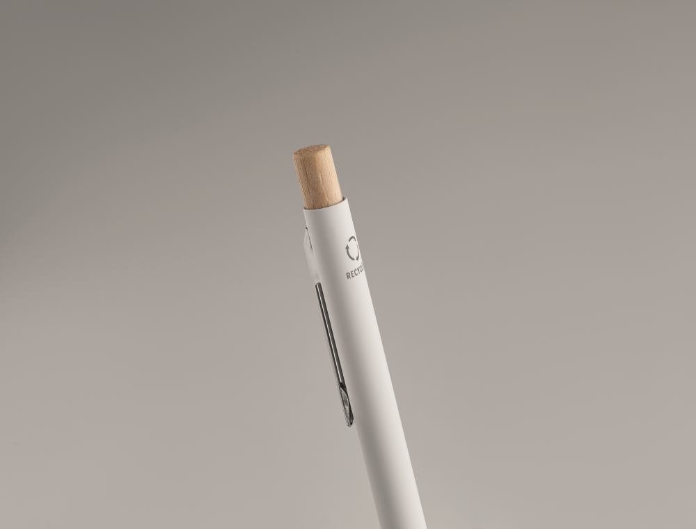 Propiska z recyklovaného hliníku s bambusovým tlačítkem. Stříbrný hrot a klip. Modrý inkoust. Rozměry: O 0,9 x 13,8 cm. Materiál: recyklovaný hliník