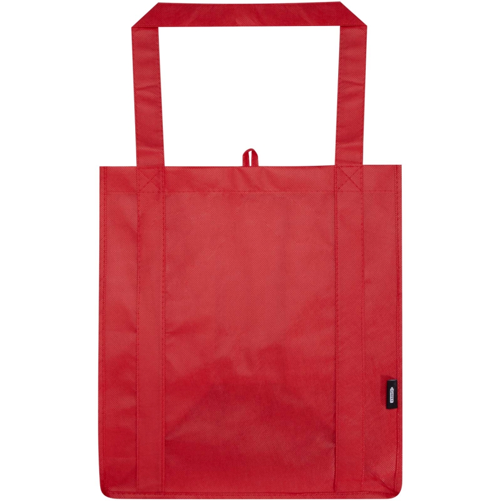 Recyklovaná nákupní taška vyrobená z odolného netkaného RPET má podpůrnou spodní desku, díky níž je univerzální a pevná. Nákupní taška má velkou hlavní přihrádku a ucha o délce 25 cm. Objemová kapacita: 29 litrů. Nosnost do 12 kg. Rozměry: 33 x 36 x 25,4 cm