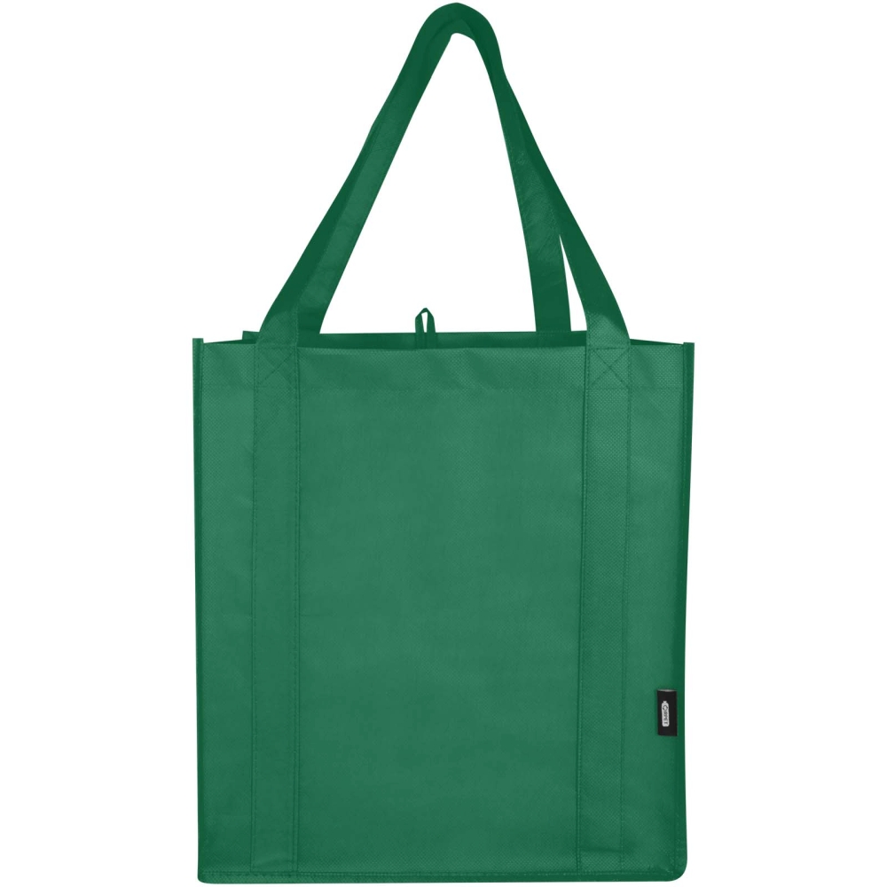 Recyklovaná nákupní taška vyrobená z odolného netkaného RPET má podpůrnou spodní desku, díky níž je univerzální a pevná. Nákupní taška má velkou hlavní přihrádku a ucha o délce 25 cm. Objemová kapacita: 29 litrů. Nosnost do 12 kg. Rozměry: 33 x 36 x 25,4 cm