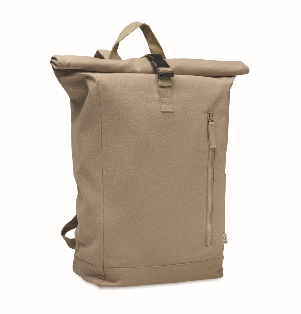 Rolovací batoh se zapínáním na suchý zip z 390g recyklované bavlny (80 %) a recyklovaného polyesteru (20 %). Přední kapsa na zip. Rozměry: 26 x 14 x 56 cm
