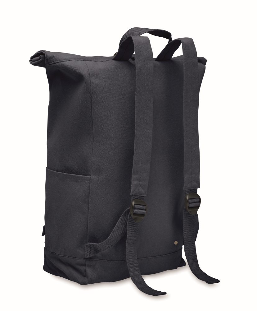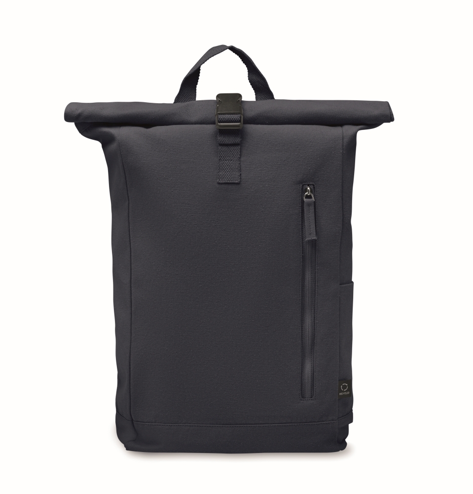 Rolovací batoh se zapínáním na suchý zip z 390g recyklované bavlny (80 %) a recyklovaného polyesteru (20 %). Přední kapsa na zip. Rozměry: 26 x 14 x 56 cm