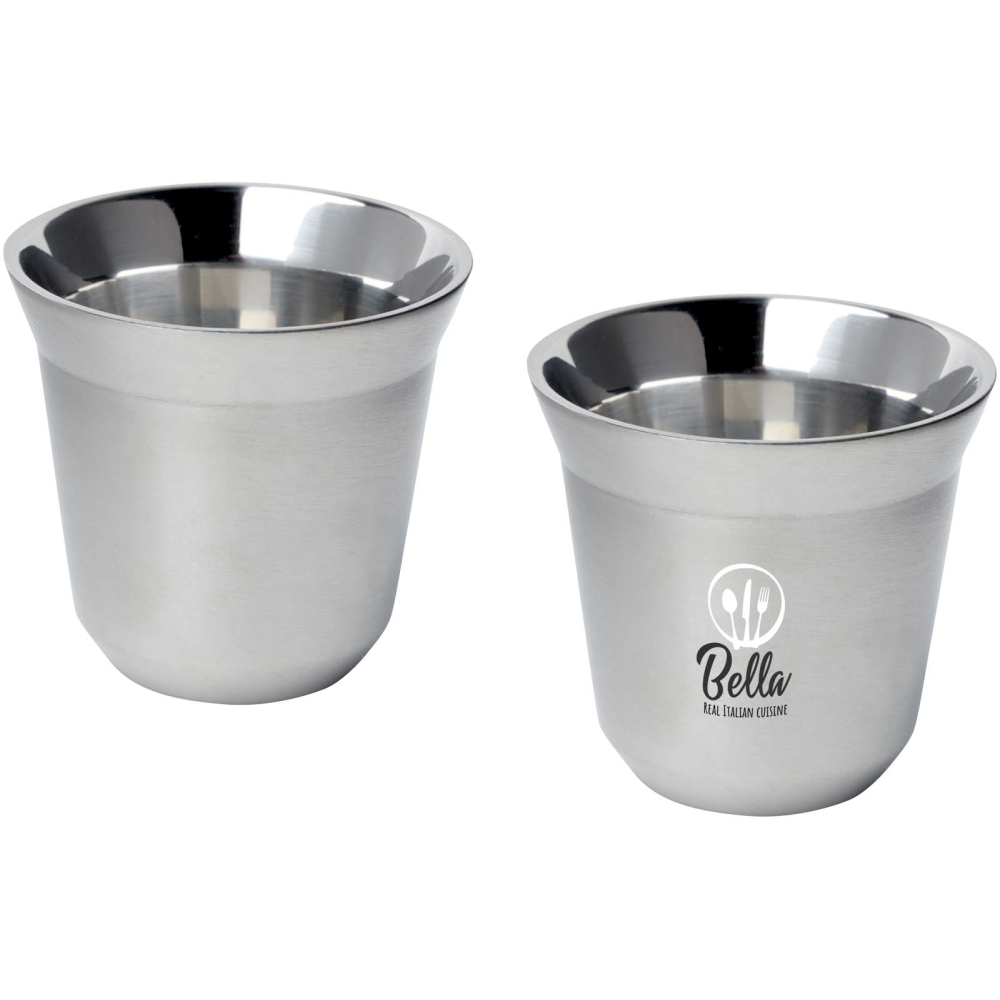 Sada 2 dvouplášťových šálků na espresso z nerezové oceli. Objem 80 ml. Dodává se v dárkové krabičce z recyklované lepenky. Rozměry: 6,2 x 6 x 6,2 x O 6,2 cm