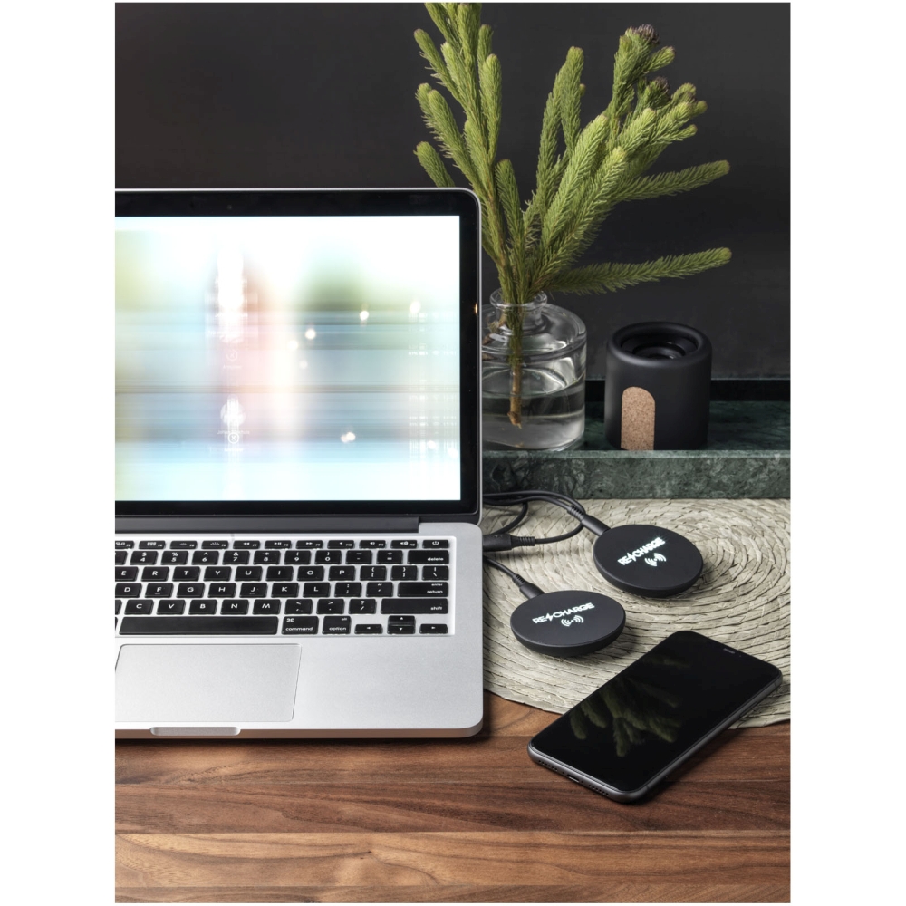 10W bezdrátová nabíjecí stanice se světelným logem a antibakteriální vrstvou, s nabíjecím kabelem z recyklovaného PET. Dodává se v černé dárkové krabičce s magnetickým uzávěrem. Rozměry: 1 x O 6,8 cm