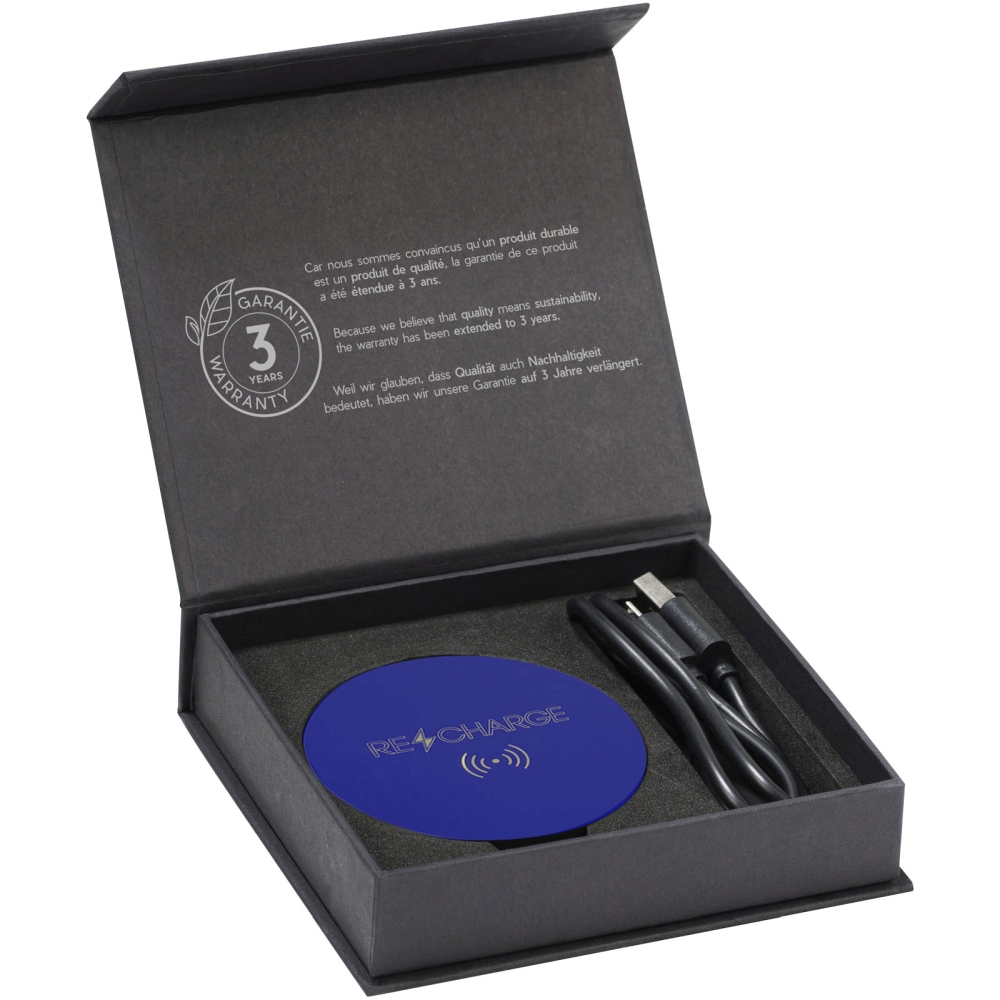 10W bezdrátová nabíjecí stanice se světelným logem a antibakteriální vrstvou, s nabíjecím kabelem z recyklovaného PET. Dodává se v černé dárkové krabičce s magnetickým uzávěrem. Rozměry: 1 x O 6,8 cm