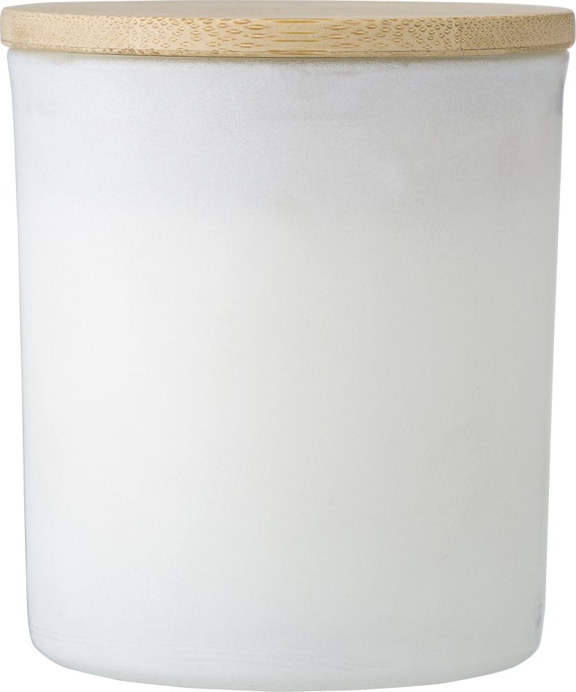 Sklenice se svíčkou z rostlinného vosku s bambusovým víčkem. Svíčka obsahuje převážně rostlinný vosk (karnaubský vosk) a její doba hoření je cca 33 hodin. Vůně svíčky se rozlišuje dle její barvy. Červená = skořice, bílá = vanilka, černá = santalové dřevo, zelená = jasmín. Každý kus je balen v bílé tubě. Rozměry: O 9.35 cm