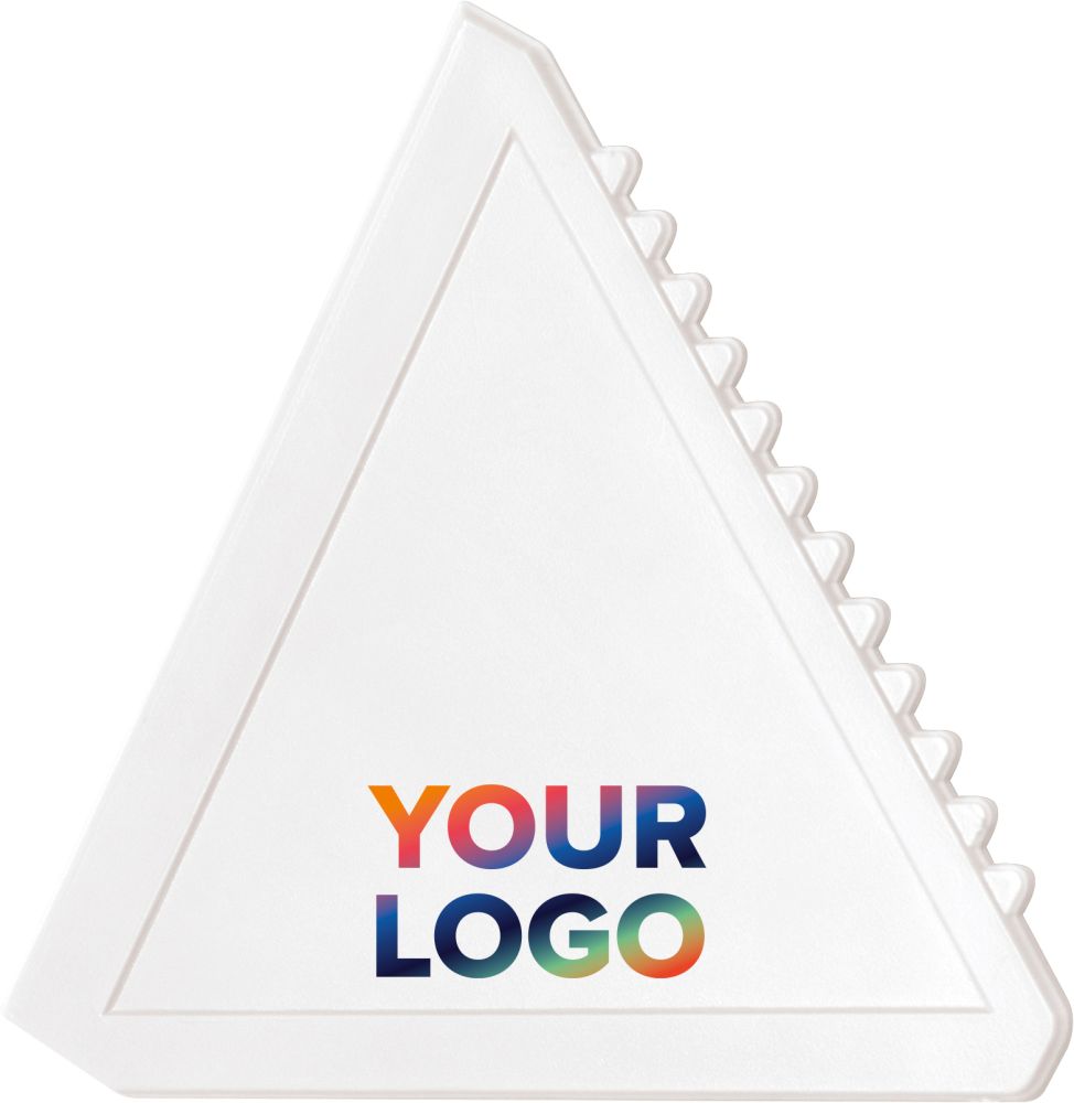 Plastová škrabka na led. Rozměry: 11,9 × 11 × 0,2 cm.