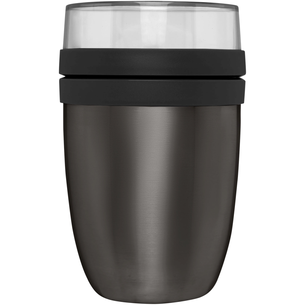 Termo obědový box s dvěma navzájem oddělenými přihrádkami. Obě přihrádky mají samostatné víčko, takže se jejich obsah nepromíchá. Udrží potraviny teplé až 10 hodin a studené až 16 hodin. Abyste měli jistotu, že jídlo si co nejdéle udrží požadovanou teplotu, doporučujeme ještě před naplněním vypláchnout box horkou nebo naopak ledovou vodou. Objem horní průhledné nádoby je 200 ml, což znamená, že může obsahovat asi 75 gramů pevných potravin. Objem spodní nádoby je 500 ml. Vyrobeno z odolného materiálu. Vnější část boxu zůstává chladná a suchá. Doporučuje se mýt ručně. Plastové části víčka lze mýt v myčce. Nepropustná. Neobsahuje BPA. Rozměry: 16,5 x O 10 cm