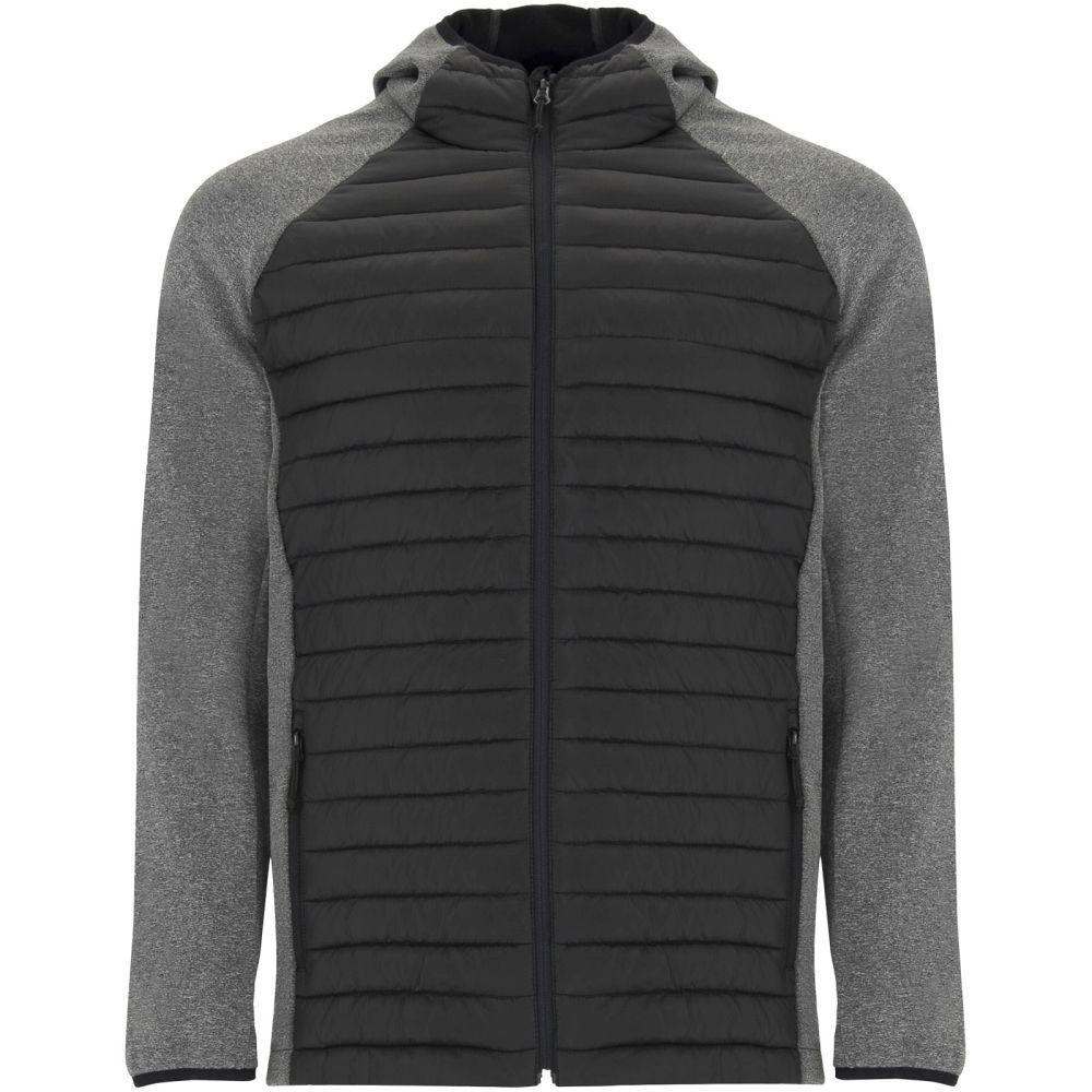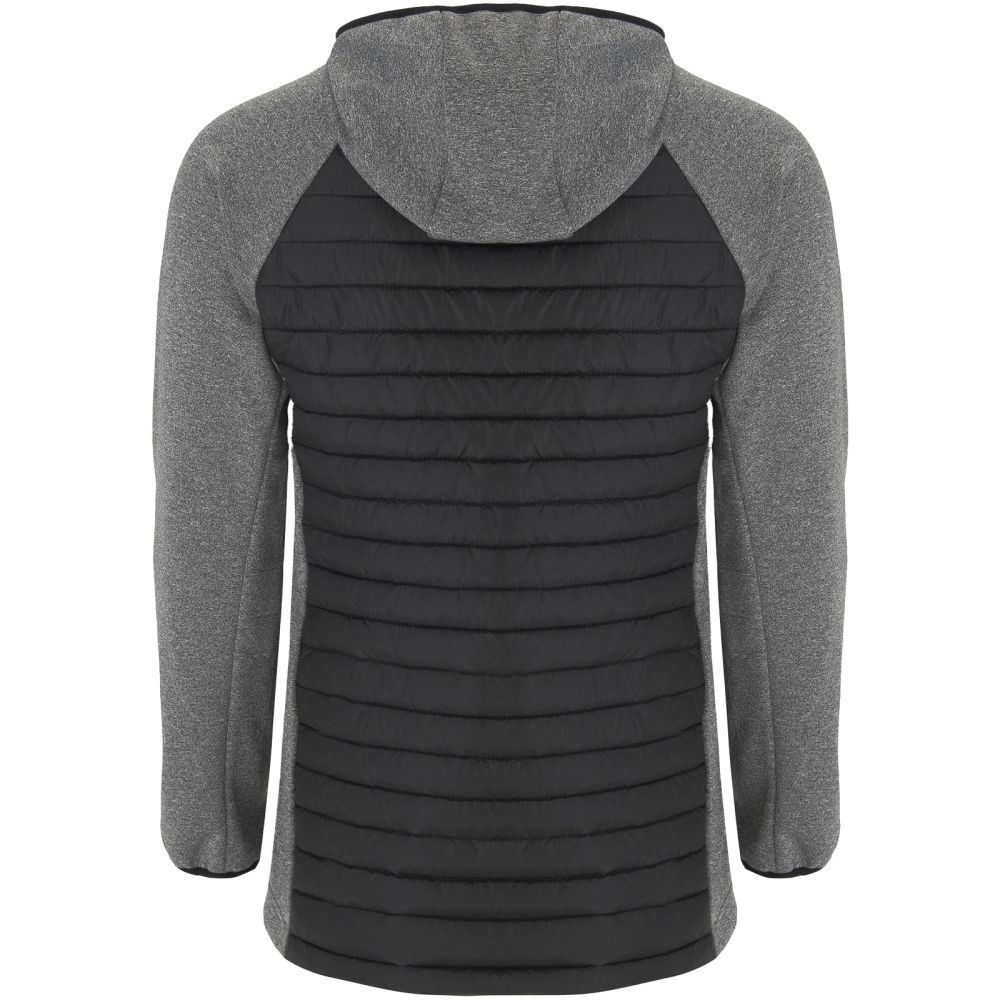 Unisex bunda v kombinaci dvou látek: Pevná nastavitelná kapuce. Raglánové rukávy. Rukávy, boční panely a kapuce ze softshellové tkaniny. Prošívaná tkanina s dotykem peří v přední a zadní části. Obrácený zip s odpovídajícím chráničem brady a taháčkem. Dvě přední kapsy na zip. Odpovídající elastické lemování límce, manžet a spodního lemu. Odnímatelný štítek. Větruodolný model. Model měří 184 cm a má na sobě velikost L, modelka měří 179 cm a má na sobě velikost S.