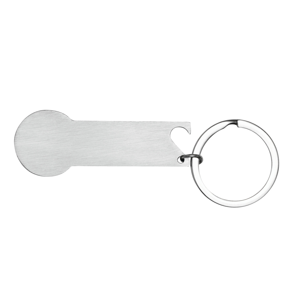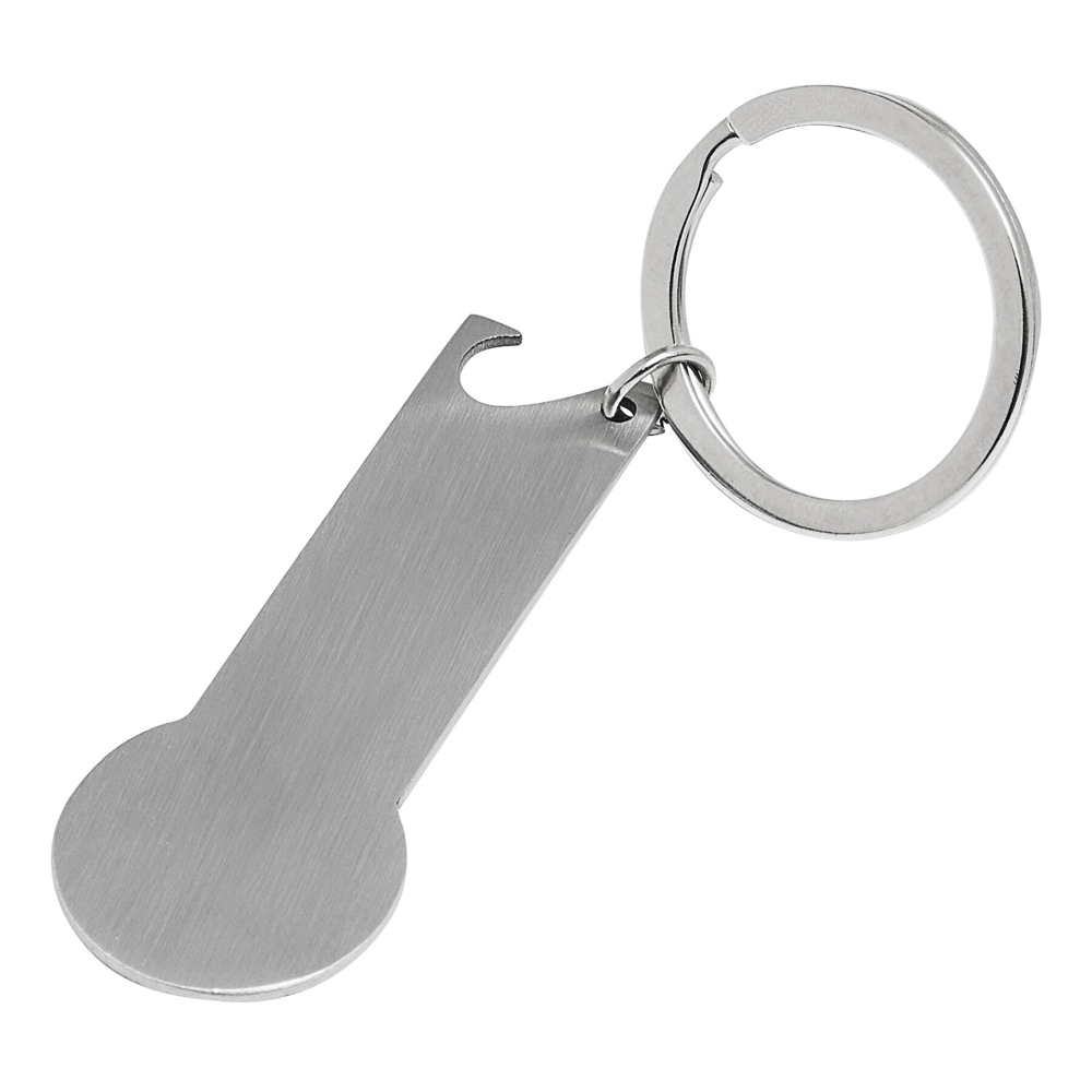 Uvolňovač nákupního vozíku, založen na velikosti 1 euromince, s integrovaným otvírákem na lahve a kroužkem na klíče. Rozměry: 6 x 2,3 x 0,1 cm