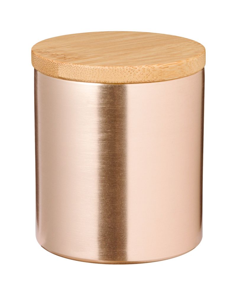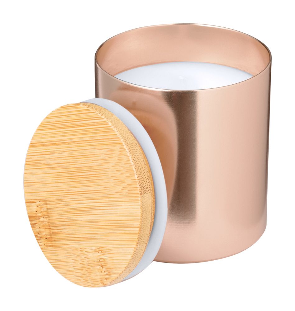 Vanilková vonná svíčka v hliníkovém držáku s bambusovým víčkem. Rozměry: o 6,5 × 7,5 cm.