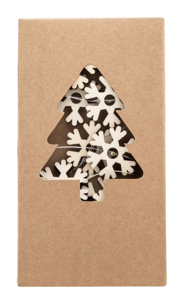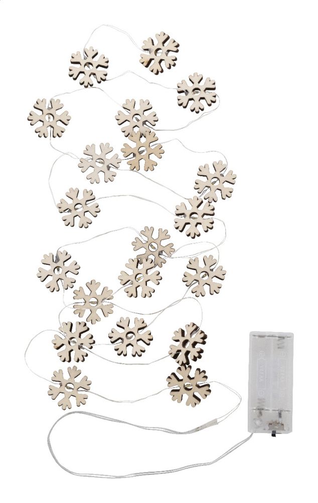 Vánoční světelná dekorace s 20 LED světly ve tvaru dřevěné sněhové vločky. Funguje na 2 AA baterie, bez baterií. S tlačítkem ZAP/VYP na pouzdře na baterie. V krabičce z kraftového papíru. Rozměry: 9 × 16,5 × 3,5 cm.
