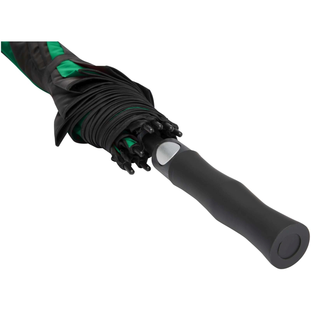 Větruodolný golfový deštník disponuje prostornou polyesterovou stříškou o šířce 140 cm, která pohodlně chrání více lidí před nepřízní počasí. Robustní laminátová tyč a rám poskytují vynikající flexibilitu a silnou odolnost vůči silnému větru. Praktická plastová rukojeť s tlačítkem pro automatické otevírání zajišťuje rychlé a snadné ovládání. Kontrastní panely stříšky představují perfektní příležitost pro výrazný a poutavý branding – ideální pro akce, reklamu nebo každodenní použití. Rozměry: 106 x 6 cm