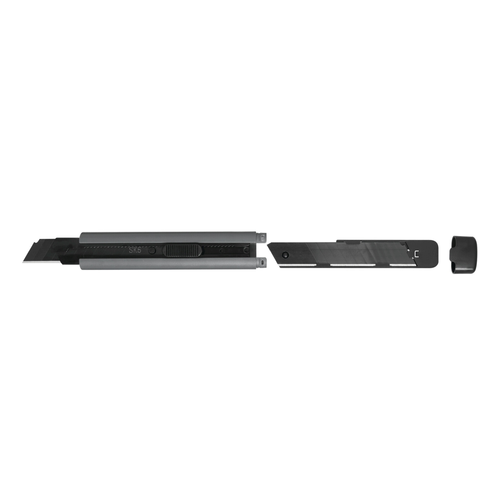 Řezací nůž s flexibilní černou odlamovací čepelí 18 mm (10 segmentů čepele a náhradní čepel), automatickým zastavením, plastovým pouzdrem a ocelovým vodítkem čepele, pro lehké až těžké řezání, v krabičce. Rozměry: 16,5 x 2,8 x 1,5 cm
