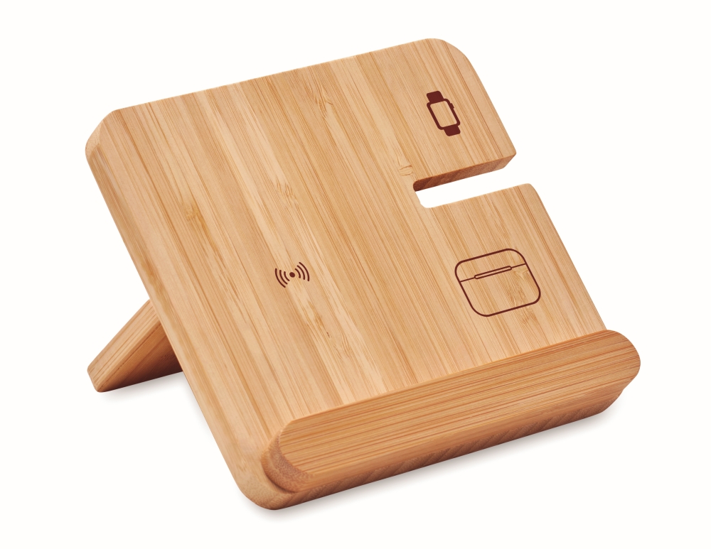 Skládací 3v1 nabíjecí stanice a stojánek na telefon v bambusovém pouzdře. Obsahuje dvoucívkovou bezdrátovou nabíječku 15W, nabíječku pro chytré hodinky (pouze Apple®) a nabíječku TWS. Rozměry: 13,9 x 13,1 x 2,7 cm