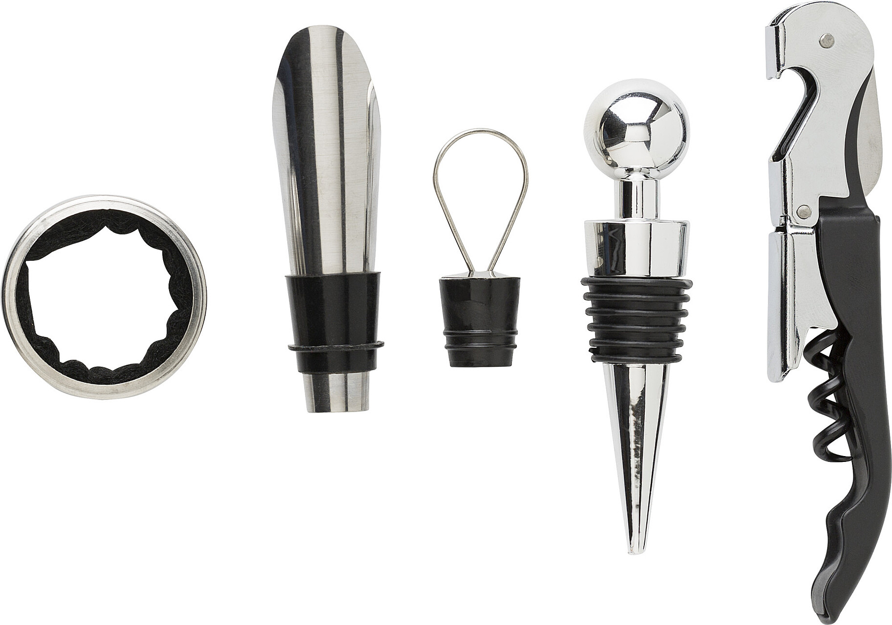 Sada na víno v korkovém pouzdře obsahující vývrtku, zátku, nálevku a kroužek na láhev. Baleno v hnědé kartonové krabičce. Rozměry: O 16,5 × 4,5 cm.
