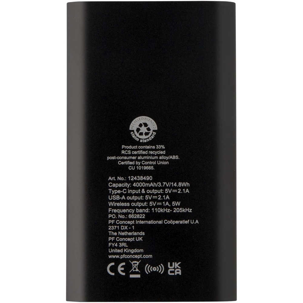 4000mAh bezdrátová powerbanka typu C z recyklovaného hliníku, černá