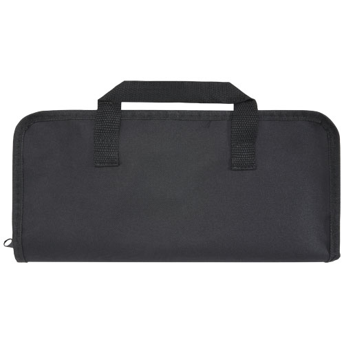 5dílná grilovací sada s obracečkou (29 × 7 cm), vidličkou (29 × 1,7 cm), nožem (29 × 2,4 cm), prkénkem na krájení (19 × 13 × 1,1 cm) a rukavicí (25 × 16 cm). Rozměry: 33 x 5 x 15 cm