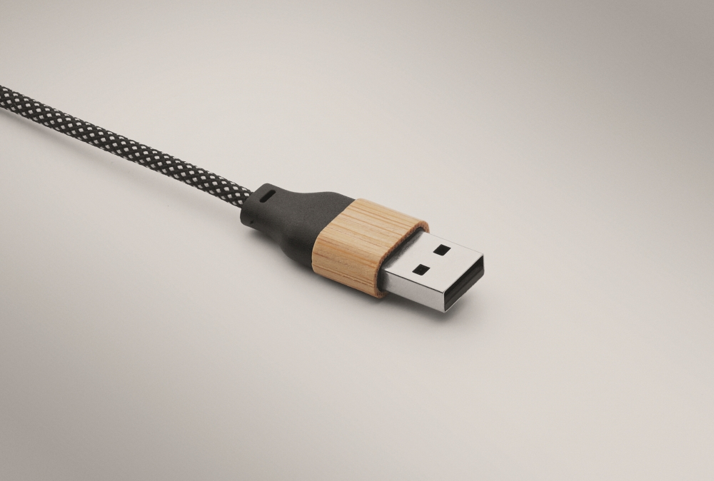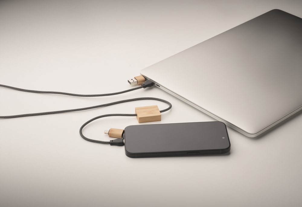 60W nabíjecí kabel z RPET s bambusovými detaily. Vstup: 2v1 Type-C a Type-A. Výstup: Type-C s konektorem 2v1. Rozměry: 100 x 2,8 x 1 cm